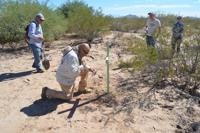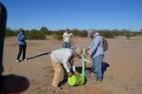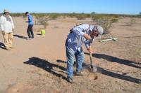 Alvaro Enciso digs a hole during a trip to a remote area in Pinal County, Arizona, where he will place a cross on Oct. 7, 2025. Enciso's has been placing crosses in memory of migrants who have lost their lives in the Sonoran Desert for 12 years. (César Barrón/CALÓ News)