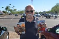 Salvador Reza, longtime immigrant rights activist and author, poses with two copies of his recently published book, "Macehualli Day Laborers: Spiritual Roots of Our Fight Against Sheriff Arpaio," outside of a Home Depot in Phoenix, Arizona. (César Barrón/CALÓ News)