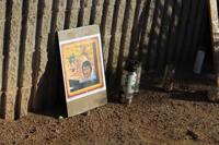 Behind MacDonald was a life-size banner with an image of the Virgin Mary, her hands together in prayer, the blue-green mantle over her tunic in shades of pink. On the ground below the image were tall candles, each with an image of her. Next to them a framed drawing titled “Jesus Migrante,” which depicts him grabbing onto a barbed wire fence with bloodied hands. Behind him, three saguaros on a hill set the desert scene.