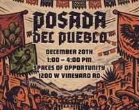 A gathering of all barrios and sponsored by Poder in Action and Carnicería Don Filo’s, Spaces of Opportunity is putting on a “decolonized posada rooted in community, culture, and collective power,” where attendees will enjoy free food, live music and danza from Grupo Corazón de Fuego Tlateyotl and community. Attendees are asked to bring a new, unwrapped toy to support Regalando Sonrisas, a “people-led toy drive for families navigating the immigration system.”