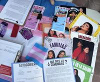 Trans Queer Pueblo's table offers informational pamphlets for the migrant community inside Heritage Square during the Latino Pride Festival on Oct. 4, 2025, in downtown Phoenix. (Nicole Macías Garibay/CALÓ News)