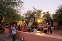 At the center of the buildings in the courtyard, water trickles down a yellow fountain with bright orange and red flower tiles. Mesquite trees provide shade.