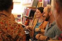 (From left) Megan Downey and Lillie Watson, worker-owners of Homeward Books Collective, listen as Eithne Luibheid talks about her newly released book, “Abolitionist Intimacies: Queer and Trans Migrants Against the Deportation State,” outside the bookshop on Thursday, Sept. 21, 2025. Downey and Watson want the book store to serve as a third space for community gatherings.