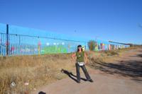 Visual artist Gretchen Baer from Bisbee, Arizona, poses for a photo in front of the border wall in Naco, Sonora, where she runs Studio Mariposa. | La artista visual Gretchen Baer, originaria de Bisbee, Arizona, posa para una foto frente al muro fronterizo en Naco, Sonora, donde dirige el Studio Mariposa. (César Barrón/CALÓ News)
