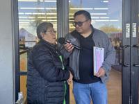 Maria Lara speaks to the judges about her chicharron in green salsa tamales, while Christian “El Ruffian” Martínez with La Tricolor 103.5 holds a microphone during Food City’s 23rd annual Tamale Making Contest on Dec. 13, 2025, in Phoenix, Arizona. (Nicole Macias Garibay/CALÓ News)