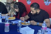 Food City District Manager Saul Olbea (right), who served as a judge during the 23rd annual Tamale Making Contest on Dec. 13, 2025, eats a tamal in Phoenix, Arizona. (Nicole Macias Garibay/CALÓ News)