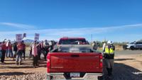 Pima County Sheriff’s Deputies move protesters to the side to make way for trucks exiting the Beale Infrastructure's Project Blue site during a protest on Friday, April 24, 2026 near the Pima County Fairgrounds. (Stephanie Casanova/CALÓ News)