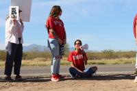 Protesters arrived at the Project Blue site at 7 a.m. Friday. They held signs that read, “Protect our desert. Fund people’s needs, not TEP,” “Stop Project Blue,” “Not one drop for data” and a blunt, handwritten “We said no!!”