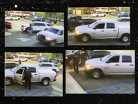 In the video, a white SUV parks behind the black truck, blocking it. A grey truck parks to the side, while a white sedan parks to the other side. Men wearing tactical vests and balaclavas get out of the cars. hey are seen approaching the man driving the black truck.