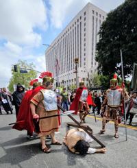 On Holy Friday, hundreds of parishioners from Nuestra Señora la Reina de los Ángeles church in historic Los Angeles walked from Placita Olvera to City Hall following a very emotional recreation of the Way to the Cross.