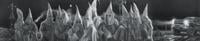 Beginning on the driver’s side of the Good Humor truck, Valdez perches admirers atop L.A.’s hills to gaze down at the 110 freeway, leading to City Hall, which is haloed by a bright sunrise that becomes a hazy and nuclear sunset as your eyes move right. Valdez’s depiction of the subject matter of the city and the environmental landscape remains black and white as the sky transitions from cotton candy pink to a deep purple and nightmarish red as you make your way around the back of the vehicle to the passenger side.