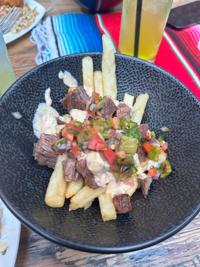 The dish is made of crispy fries, steak marinated in Serrano Cilantro Ponzu, dressed with Chili Garlic Miso Aioli and Nopal Pico de Gallo.