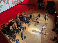 As we entered the Segerstrom, in the center, there was a beautiful altar in honor of Día de Muertos. There were many white skeletons with hints of various colors, along with candles and plants. There even seemed to be red gerbera daisies and cactuses. And, of course, Mexican papel picado also made up this shrine.