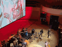 Last but certainly not least were the images on display on the big screen (on top of the band). With each song, there were either titles or different icons like cartoon instruments or caricatures of individuals at war. At one point, the screen was all in black, emulating Lila’s movements in skeleton form through neon colors. To me, this was all aligned with the Día de Muertos theme of her show.