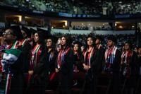 Graduating students take their seats at the Fresno State Chicano/Latino Commencement Celebration in the Save Mart Center in Fresno on May 18, 2024. Photo by Larry Valenzuela, CalMatters/CatchLight Local