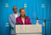 Karen Bass dirigiéndose a los medios de comunicación en el evento del jueves. Foto de Brenda Verano