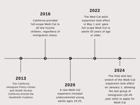 What followed was the Young Adult Expansion, which was signed into law in 2019 and provided full-scope Medi-Cal to young adults 19 through 25. In 2023, the Older Adult Expansion, which provided full-scope Medi-Cal to adults 50 or older, was signed into law.