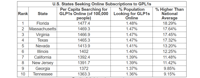 Florida, ranking in the top spot, was the nation’s biggest hotspot for online interest. The data shows 1,477 people per 100,000 residents in the state are searching every month for GLP-1 weight-loss drugs, more than 18% higher than the national average.