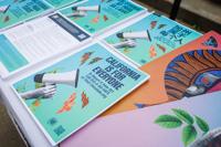 The artwork, which was showcased in flags and adorned the background of the press conference, was created and assembled by 16 working-class immigrant women. “How I Keep Looking Up/Como Sigo Mirando Hacia Arriba/ä»°æ” was a product of a series of workshops where the women shared their migration journeys, developed design skills and created the flags alongside one another.