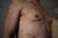 After receiving a double lung transplant, Oscar’s chest is marked by two scars just below tattoos of his daughter’s names, Los Angeles, Jan. 24, 2026. (By Semantha Raquel Norris)