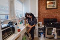 Isabel Lomeli and her daughter, Gianna, embrace in the kitchen of their home in El Sereno, as they talk about all the renovations their small kitchen needs, on Sept. 9, 2024. The pair have lived in the Caltrans-owned duplex unit for 14 years. (Photo by Zaydee Sanchez for CalMatters)