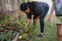 Isabel Lomeli picks vegetables from her garden in the backyard of their home in El Sereno on Sept. 9, 2024. She says she can’t afford to buy the whole duplex but wanted to buy her home. (Photos by Zaydee Sanchez for CalMatters)