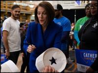 U.S. Sen. Catherine Cortez Masto (D-NV) signs a chefs hat after giving victory remarks at Carpenters International Training Center on November…