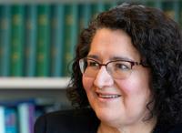 A photo of Carolina Reyes in front of a bookshelf indoors.